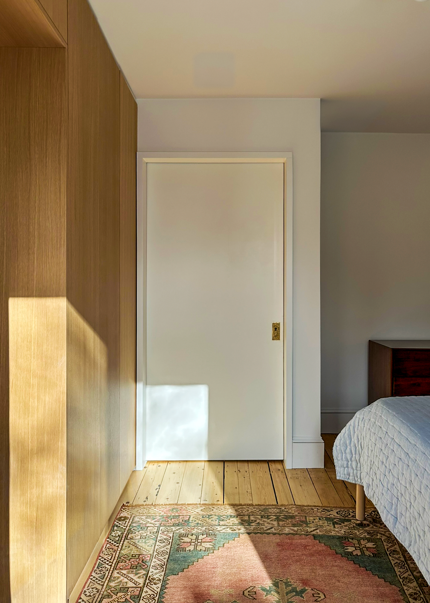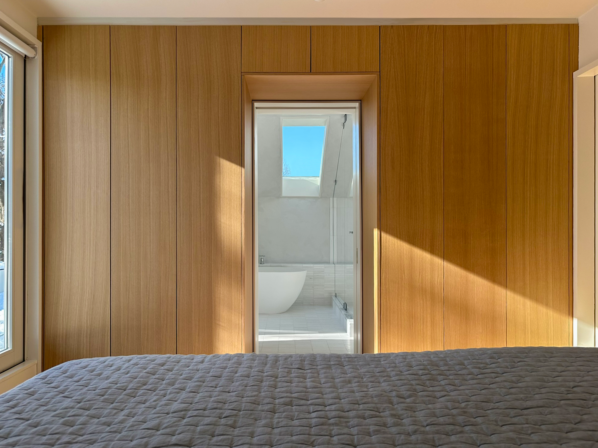 A wall of built-in white oak wardrobes divides the sleeping area from the bathroom. A deep oak portal with concealed pocket door leads to the bathroom. The bathroom has a sloped plaster ceiling matching the ceiling in the bedroom. A high skylight centrally located into the bathroom maintains privacy and is visible from the bedroom through the oak portal. The room is flooded with natural light, and the view of the sky provides a visual relief to the sloped ceiling.