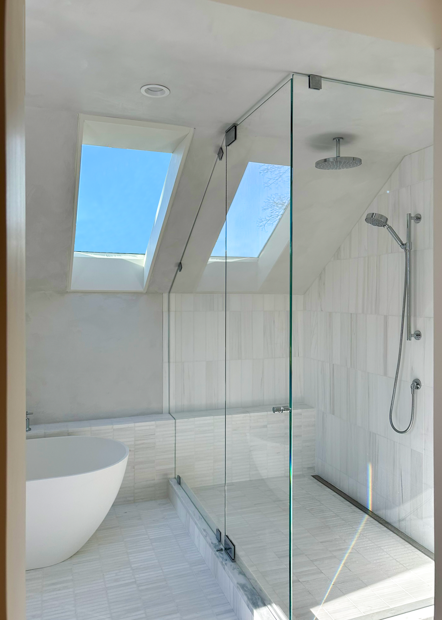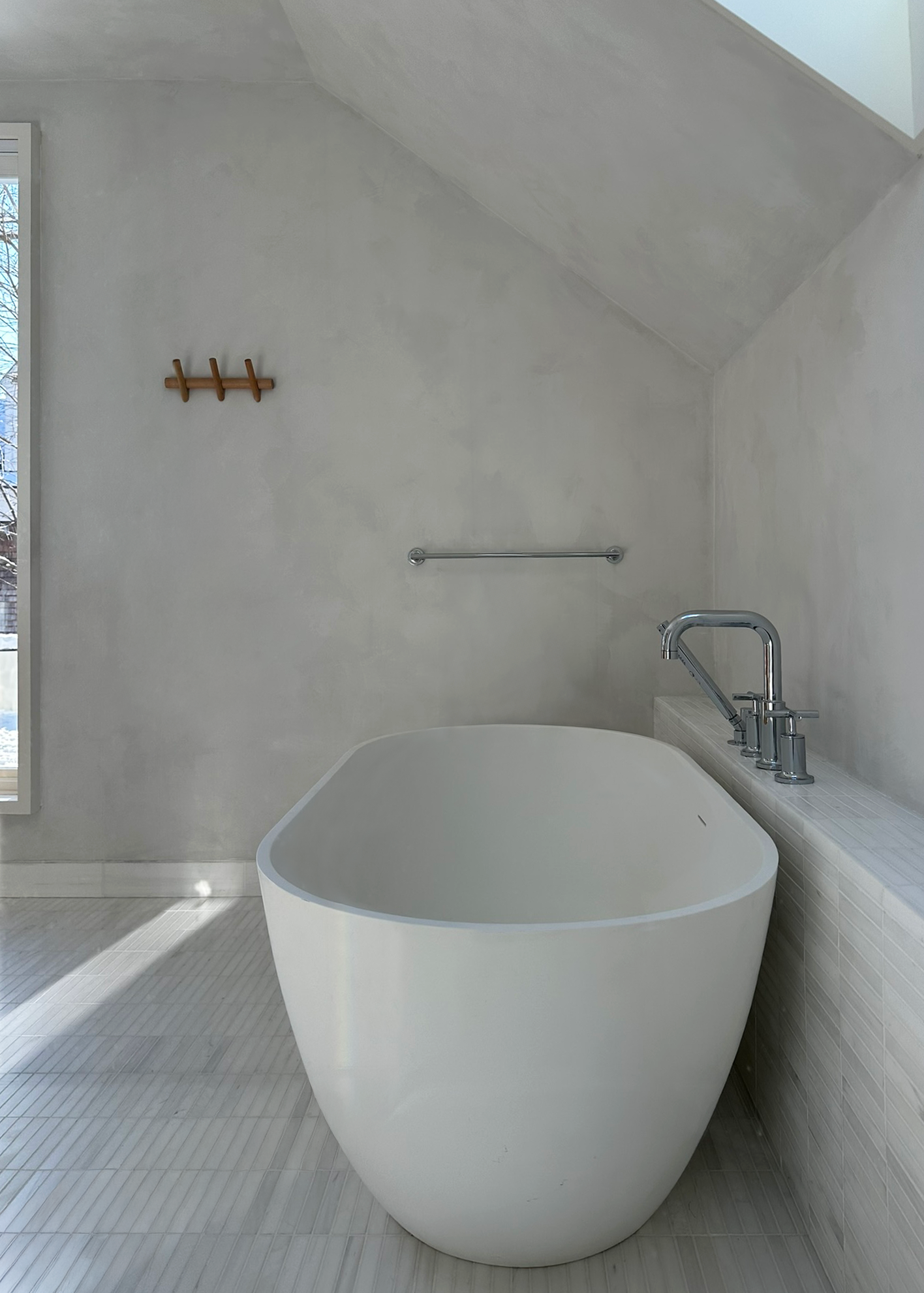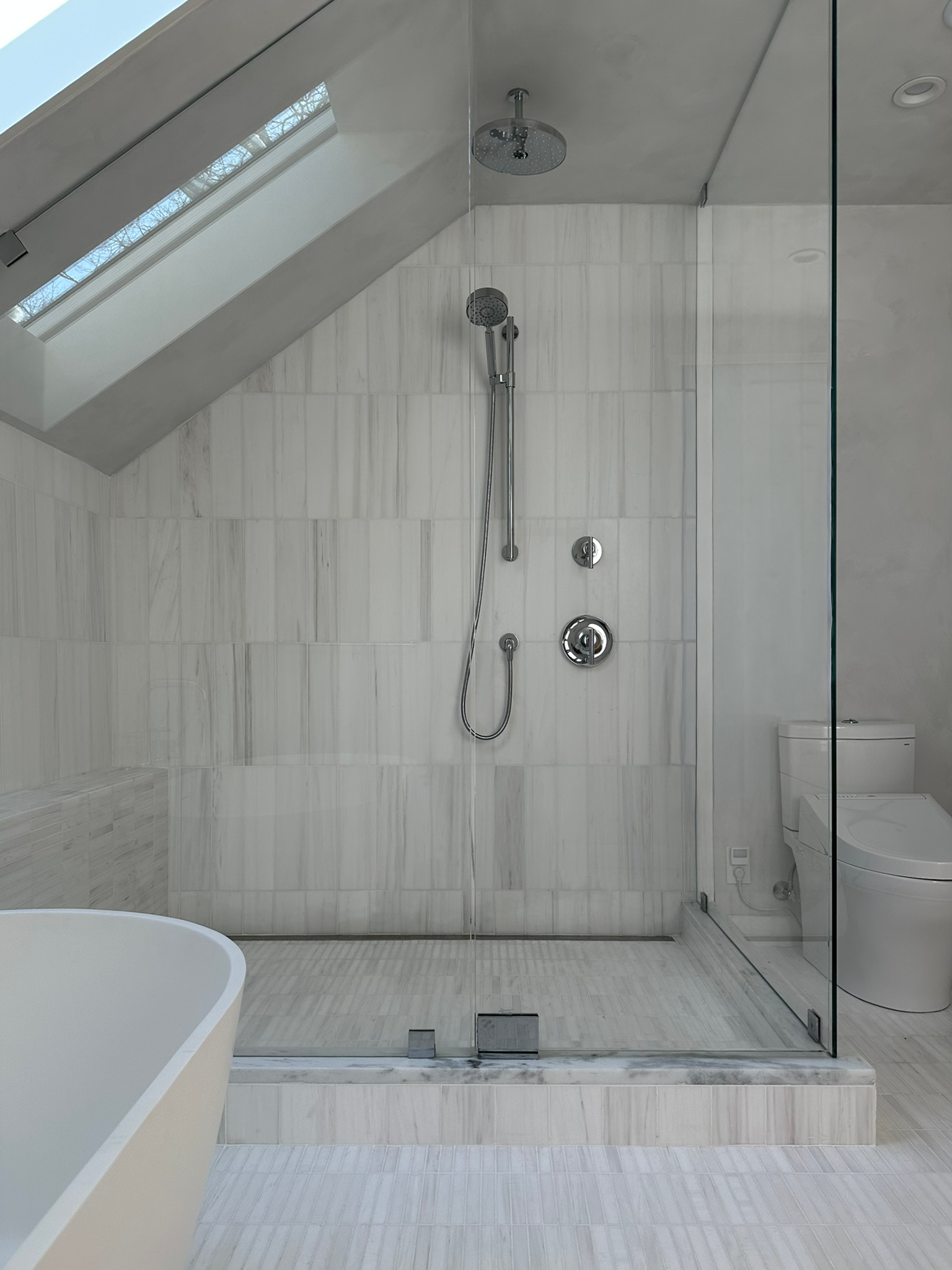 The bathroom is finished with a restrained material palette. The honed white dolomite marble of the floor wraps the shower walls and a low storage surface alongside the soaking tub that extends into the shower as a seat. The walls are finished in a lime plaster that is water resistant and color matched to the dolomite marble tile. The oversized shower feels open to the room with its full height frameless glass shower enclosure.