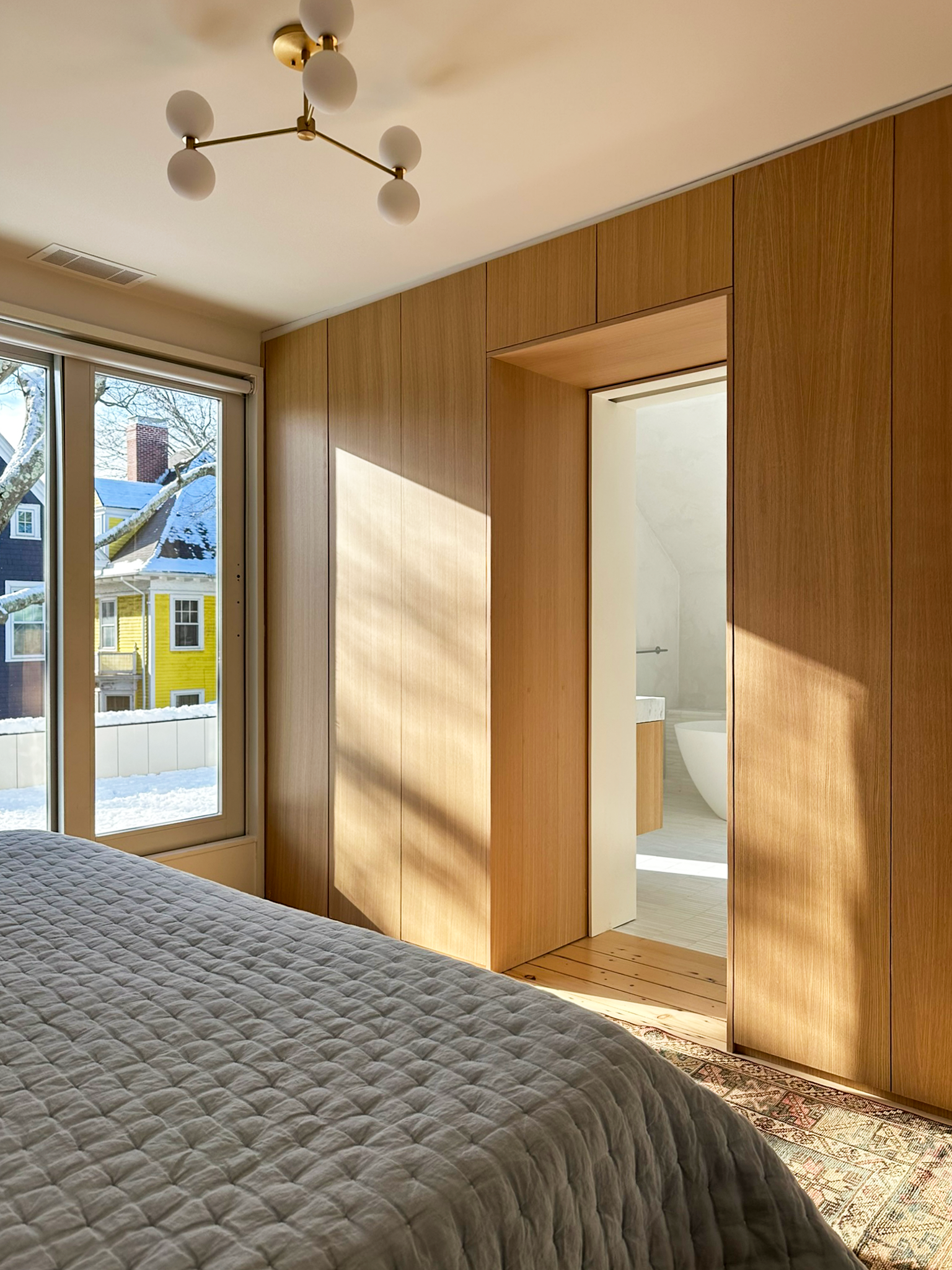 The downstairs reconfiguration of the kitchen allowed for the renovation of the existing second floor bedroom directly above it into a new primary bedroom suite. With the back staircase now removed, the existing bedroom suite is now able to extend the full width of the house.
