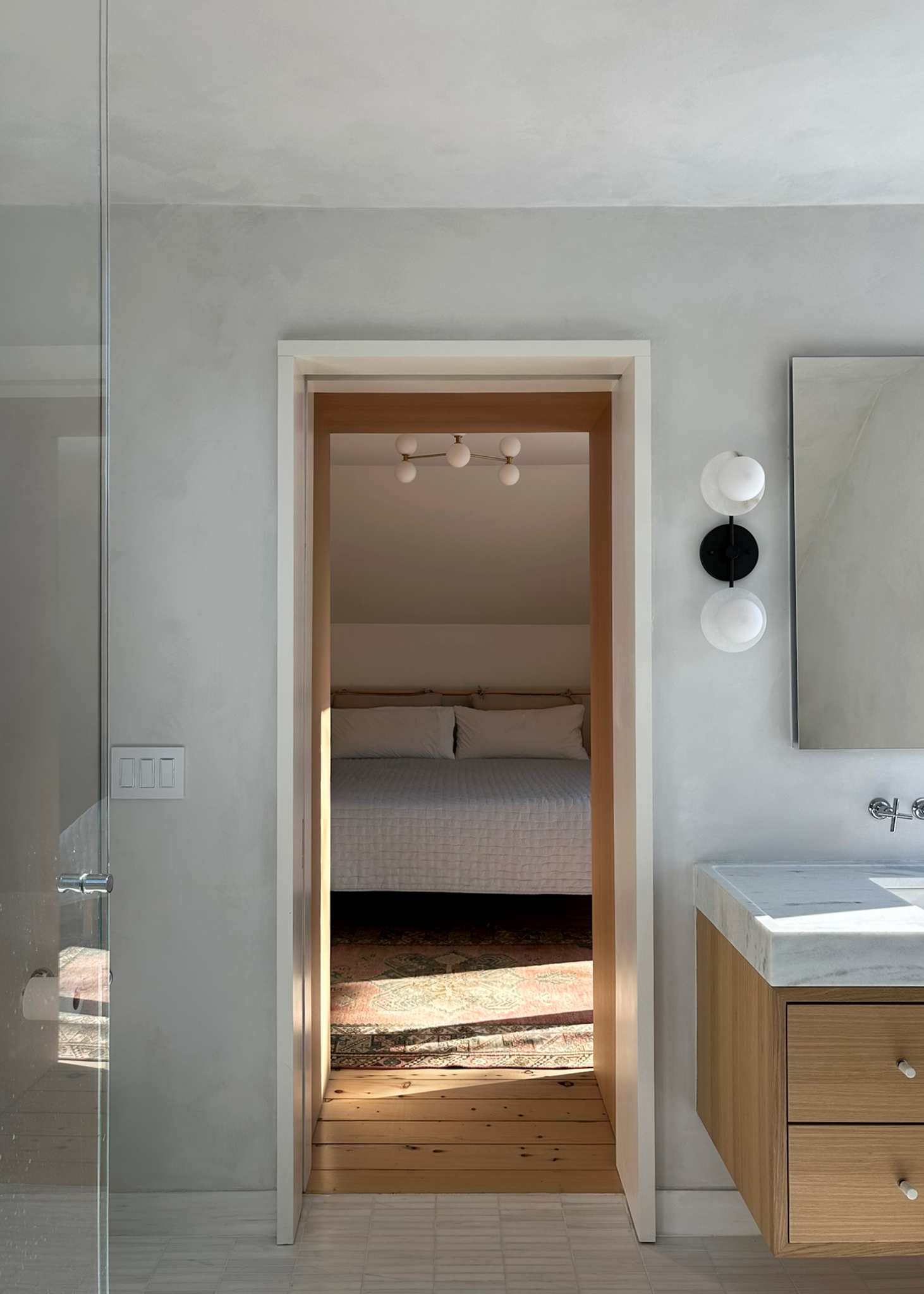 The floating bathroom vanity is of the same white oak as the bedroom wardrobes and topped with a white marble top. Large frameless medicine cabinet floats on the lime plater wall and is naturally lit by the full height window to the side of the vanity.