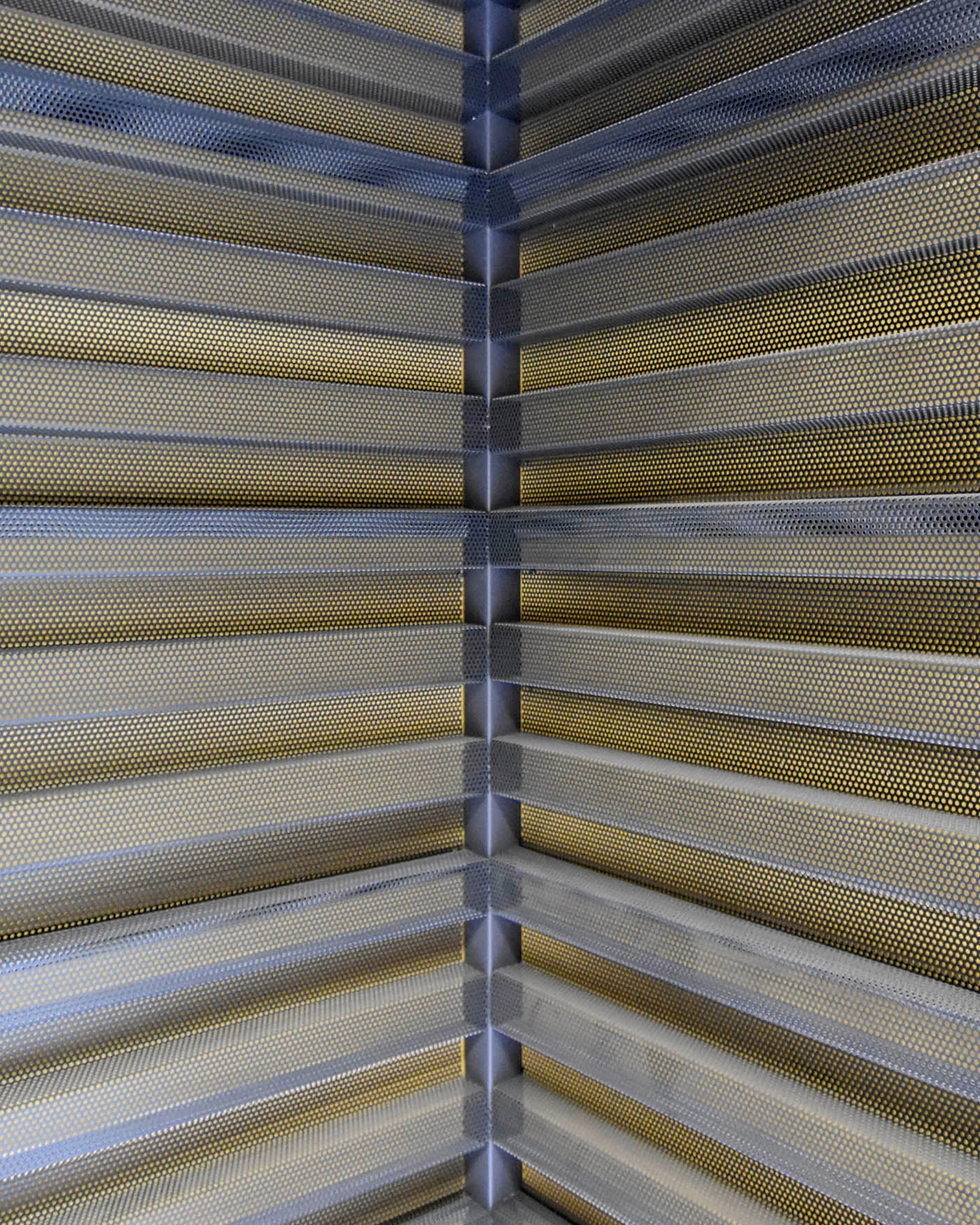 Large 8’-high by 10’-wide segments of the oak wall are mounted on custom steel tracks, allowing them to slide aside and reveal three large alcoves lined with corrugated metal and a bronze-colored wall visible through perforations. These alcoves are programmed depending on the event, with features like a mobile bar, storage, and a projection screen.